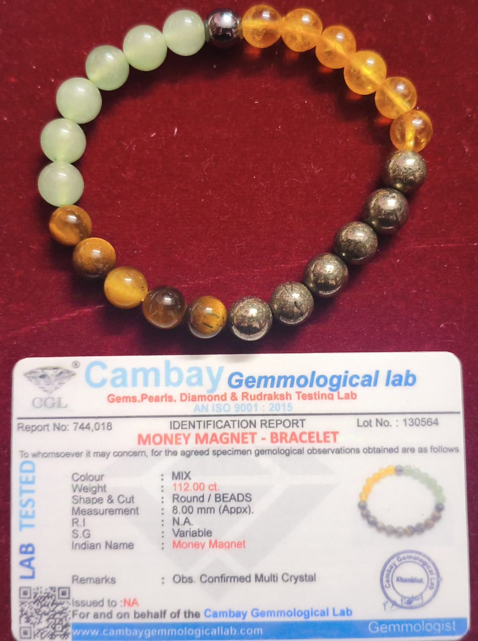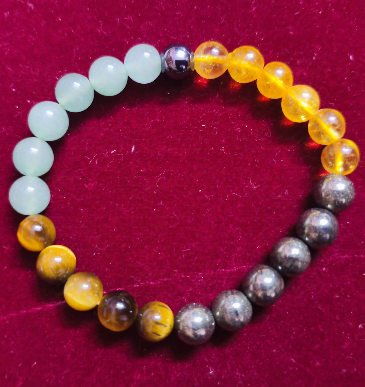 THIS MONEY MAGNET BRACELET IS ALL NATURAL WITH PYRITE , CITRINE, GREEN AVENTURINE , TIGER EYE THIS CVOMBNINATION HELP TO ATTRACT MONEY& WEALTH AND BOOST YOUR AURA THIS BRTACELET WILL BE GIVEN WITH FREE 5 MUKHI RUDRAKSH PENDANT